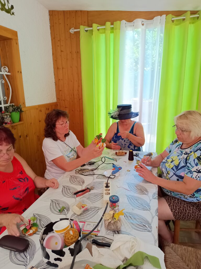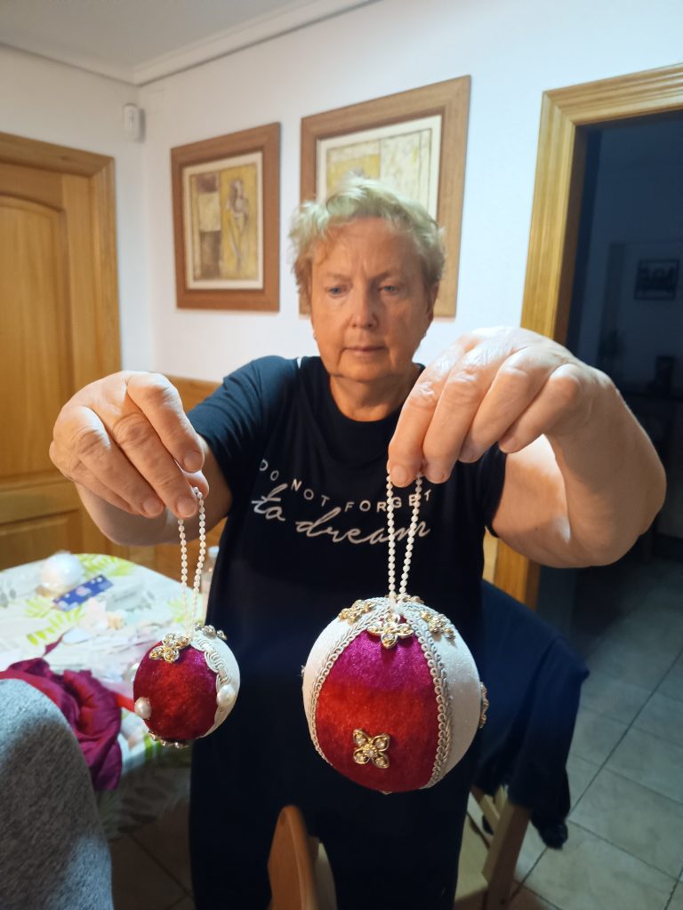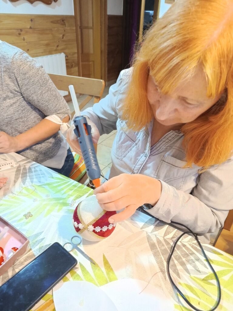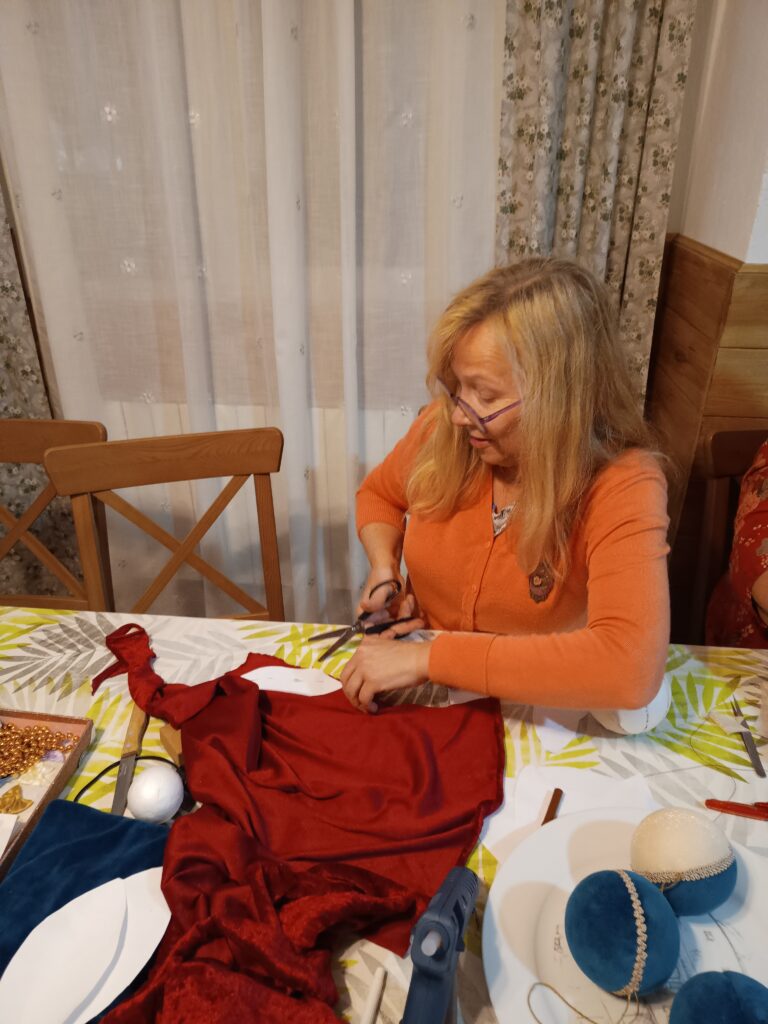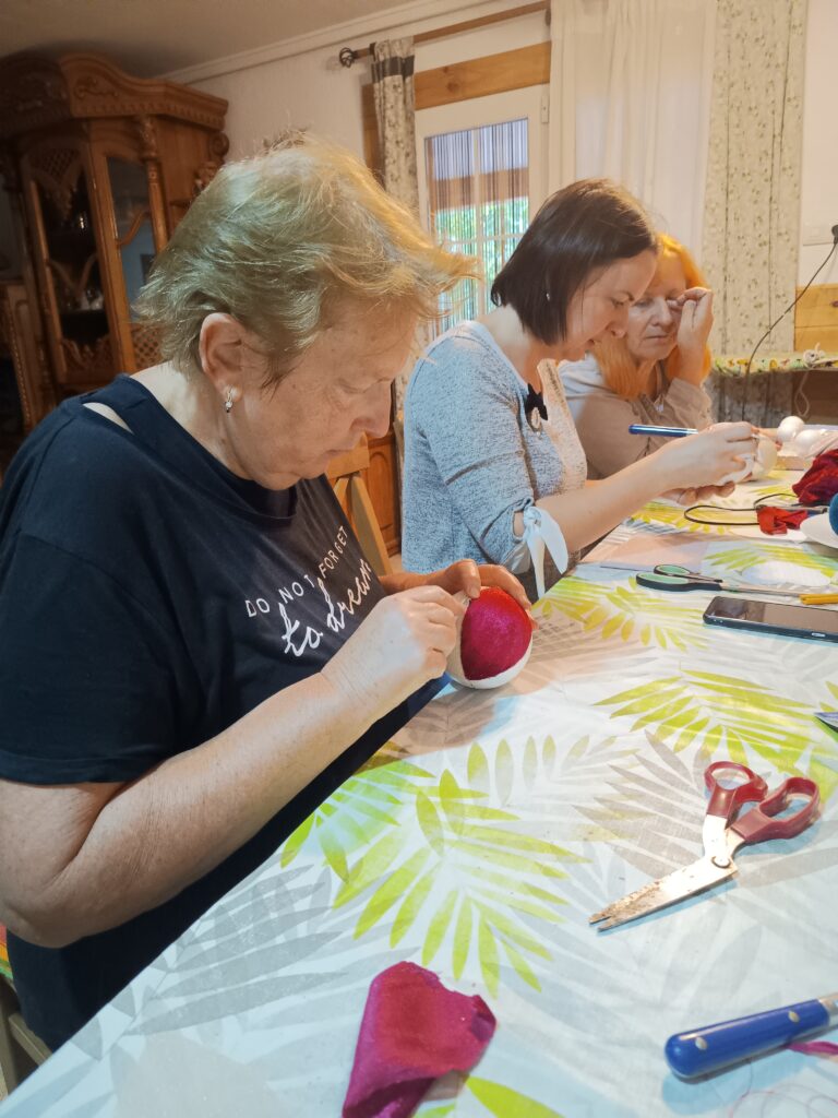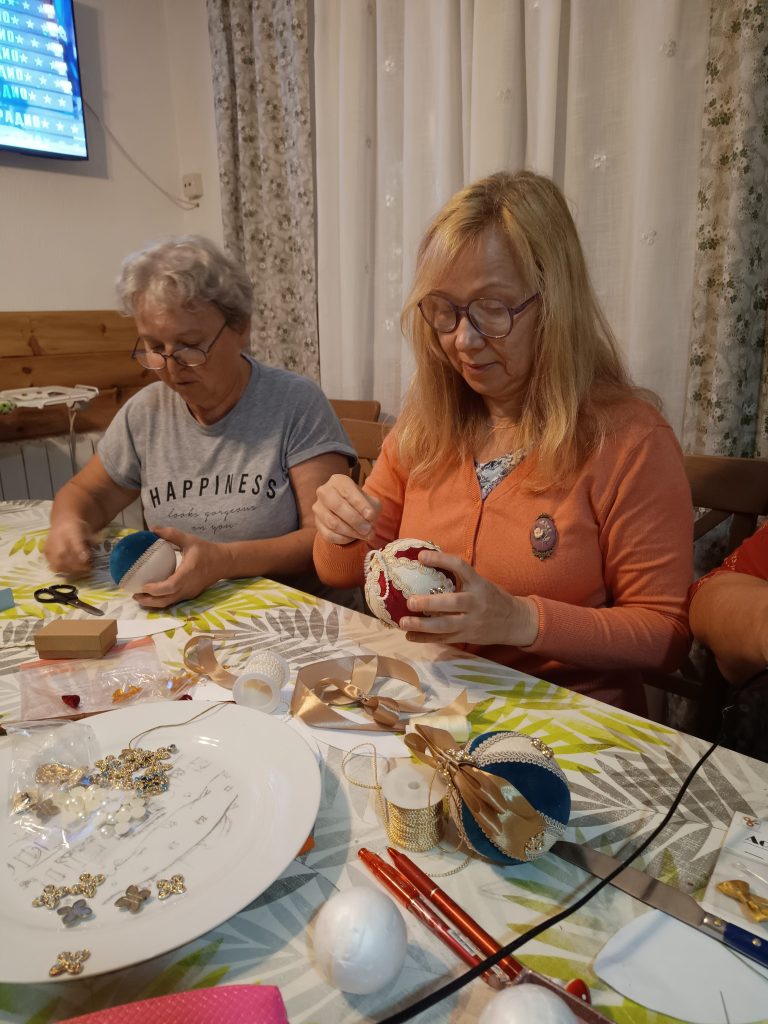 Рабочие столы быстро превратились в настоящие мастерские чудес. Кто-то задумал сделать ёлочную игрушку с бусинками, кто-то — с ангелочками, а кто-то — с юмором, добавив своему шедевру забавные глазки и бантик на бок. И всё это — под хохот, рассказы, «А помнишь?..» и невероятную творческую энергию.