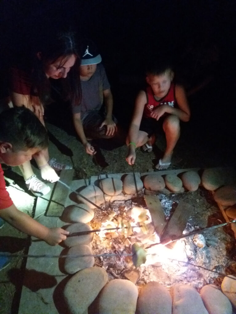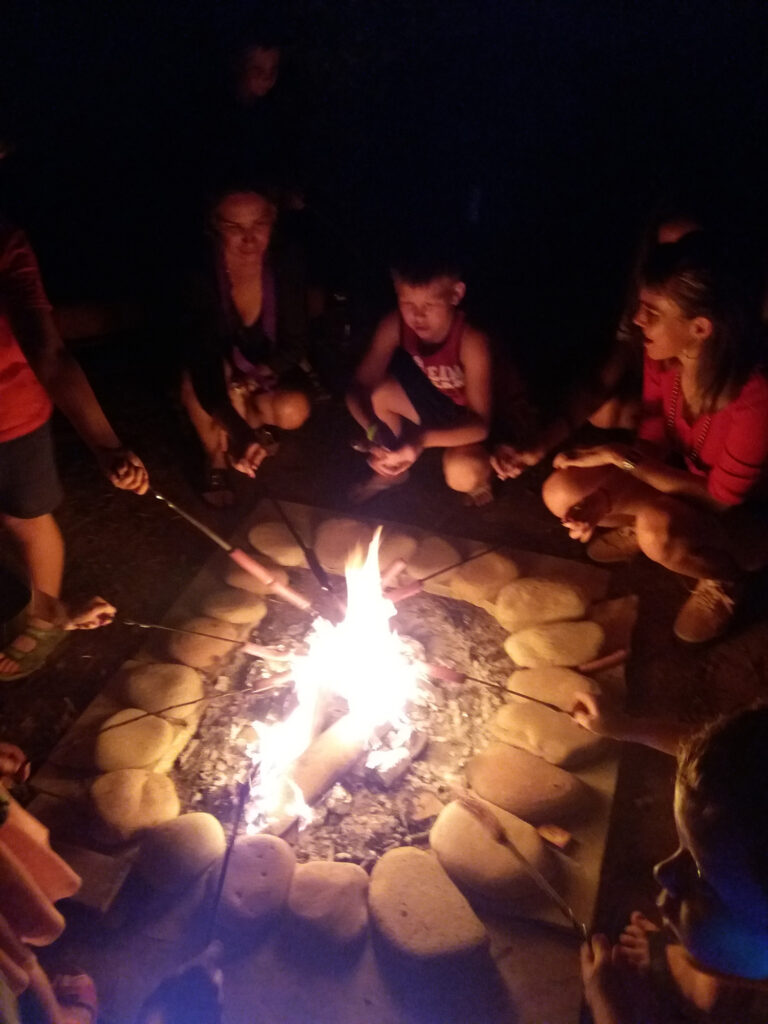 — и, конечно же, костёр, хрустящий хлеб на палочке, как в настоящем лагере, песни под звёздным небом — какая же компания без этого!