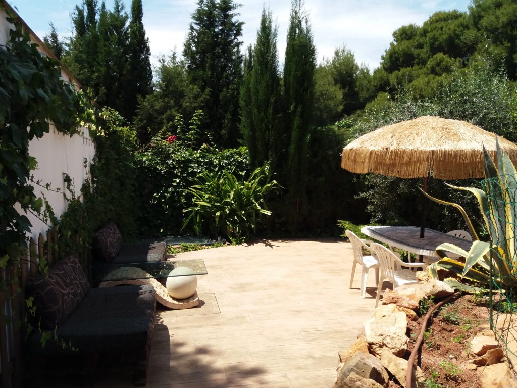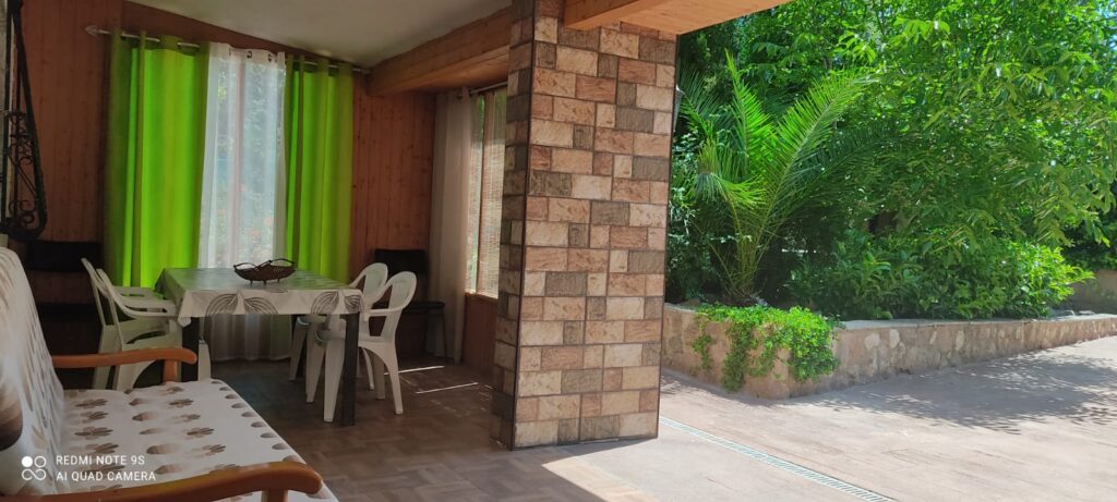 Вилла и Гостевой дом — это деревенский оазис (в стиле рустико) на участке 22 соток, полностью огороженном, посажено 120 кипарисов, туй и можжевельника, высажены апельсины и мандарины. Окружен соснами и другими вечнозелеными деревьями и кустарником.