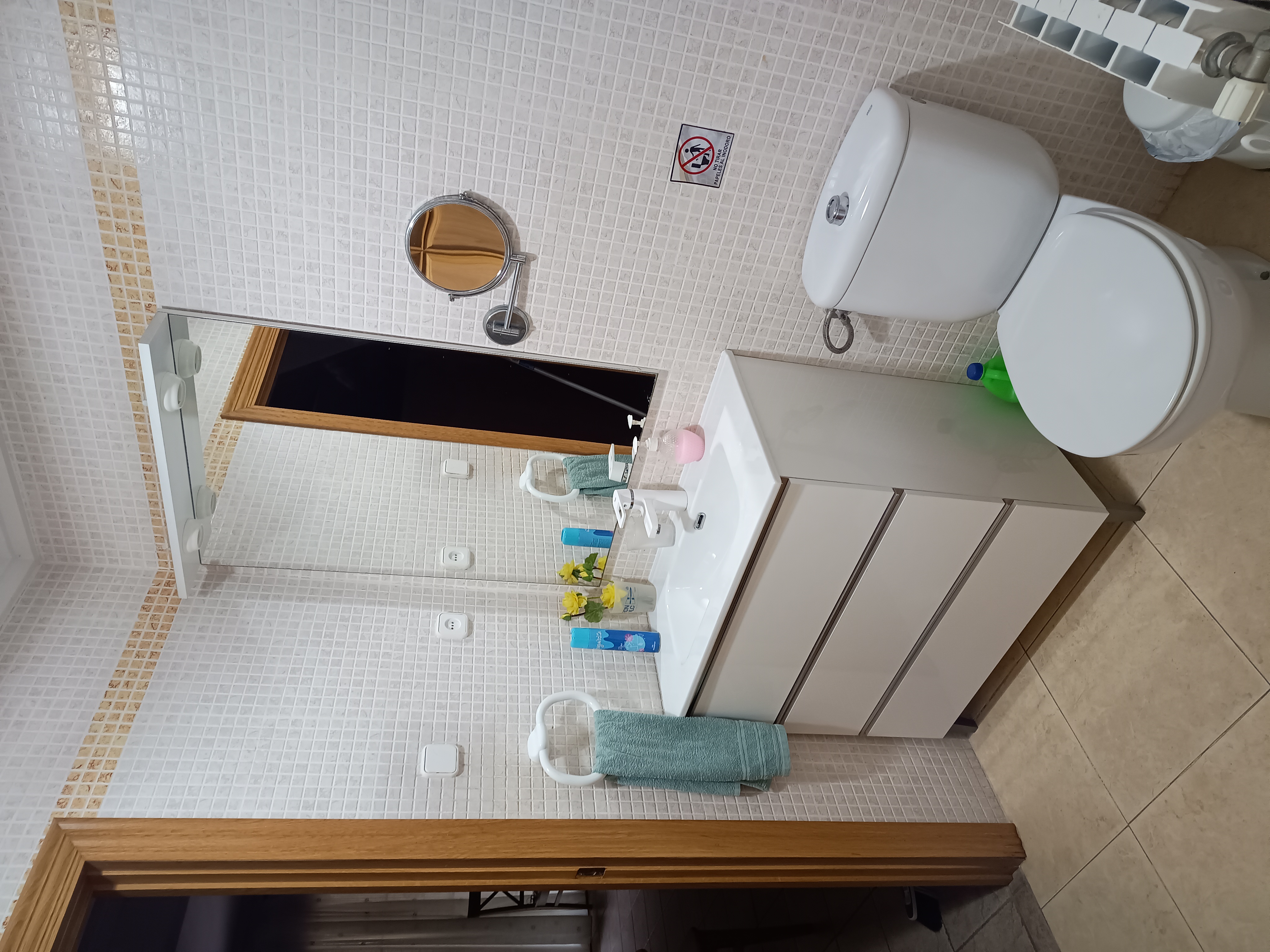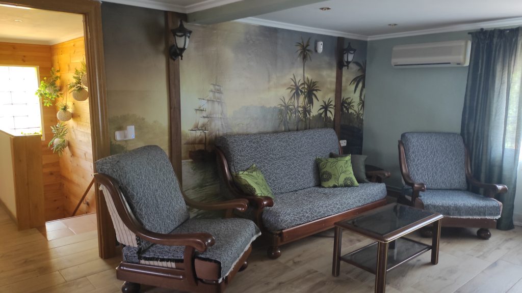 2 этаж – Крытая терраса с входом в дом и выходом в сад, озеленена и оборудована летней мебелью. На втором этаже расположены салон-гостинная с ТВ, кондиционером и мягкой мебелью, два санузла с душем находятся на этаже и две комнаты N2 и N3 . Лестница на 3 этаж.