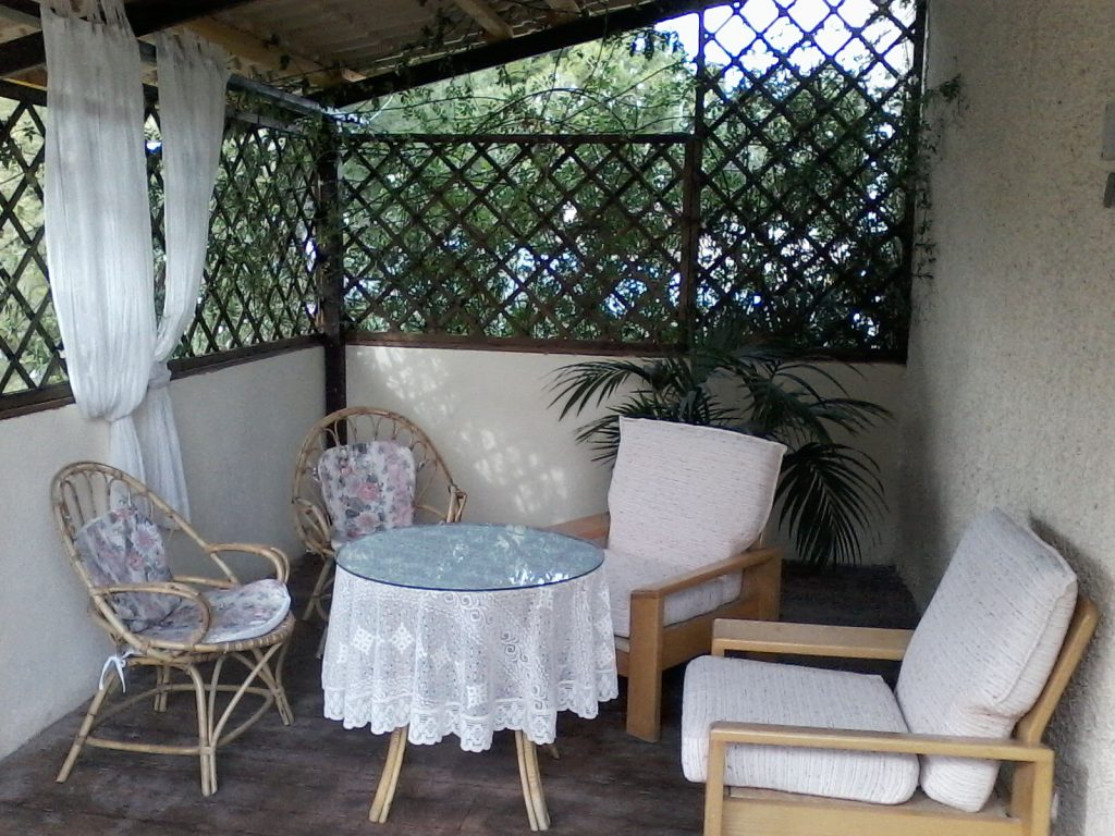 1 этаж – Крытая терраса, частично застекленная и меблированная летней мебелью для отдыха, основной вход в дом с этой террасы. У входа на террасу расположен летний туалет.