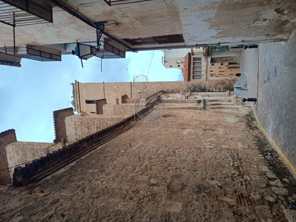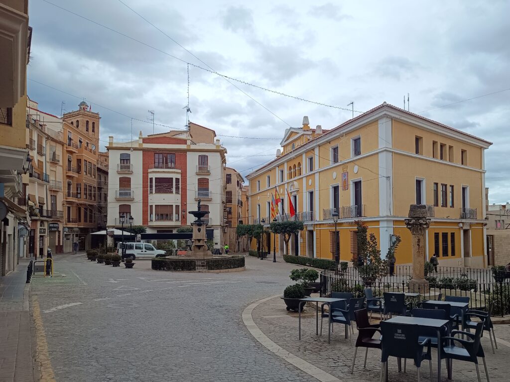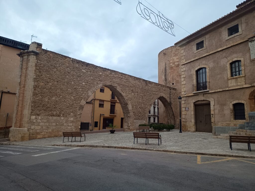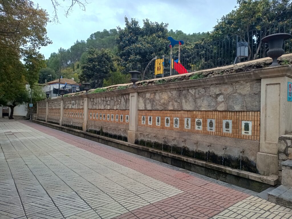 Наша прогулка продолжается и мы спускаемся к знаменитому фонтану «Источник 50 струй» — по-испански Fuente de los 50 Caños. Это исторический источник с длинной каменной стеной, в которой расположены 50 металлических труб (струй). Из каждой течёт питьевая вода, традиционно считается, что она чистая и пригодна для питья. Фонтан был построен в XVII веке (примерно в 1636 году) во времена правления герцогов Сегорбе. Он был важной частью городской системы водоснабжения. 50 струй символизируют изобилие воды, что является редкостью для региона. Он выполнен в классическом стиле с каменной кладкой и арками с гербами провинций Испании. Находится рядом с прогулочной зоной и часто служит местом отдыха, а местные жители и туристы до сих пор набирают там воду.